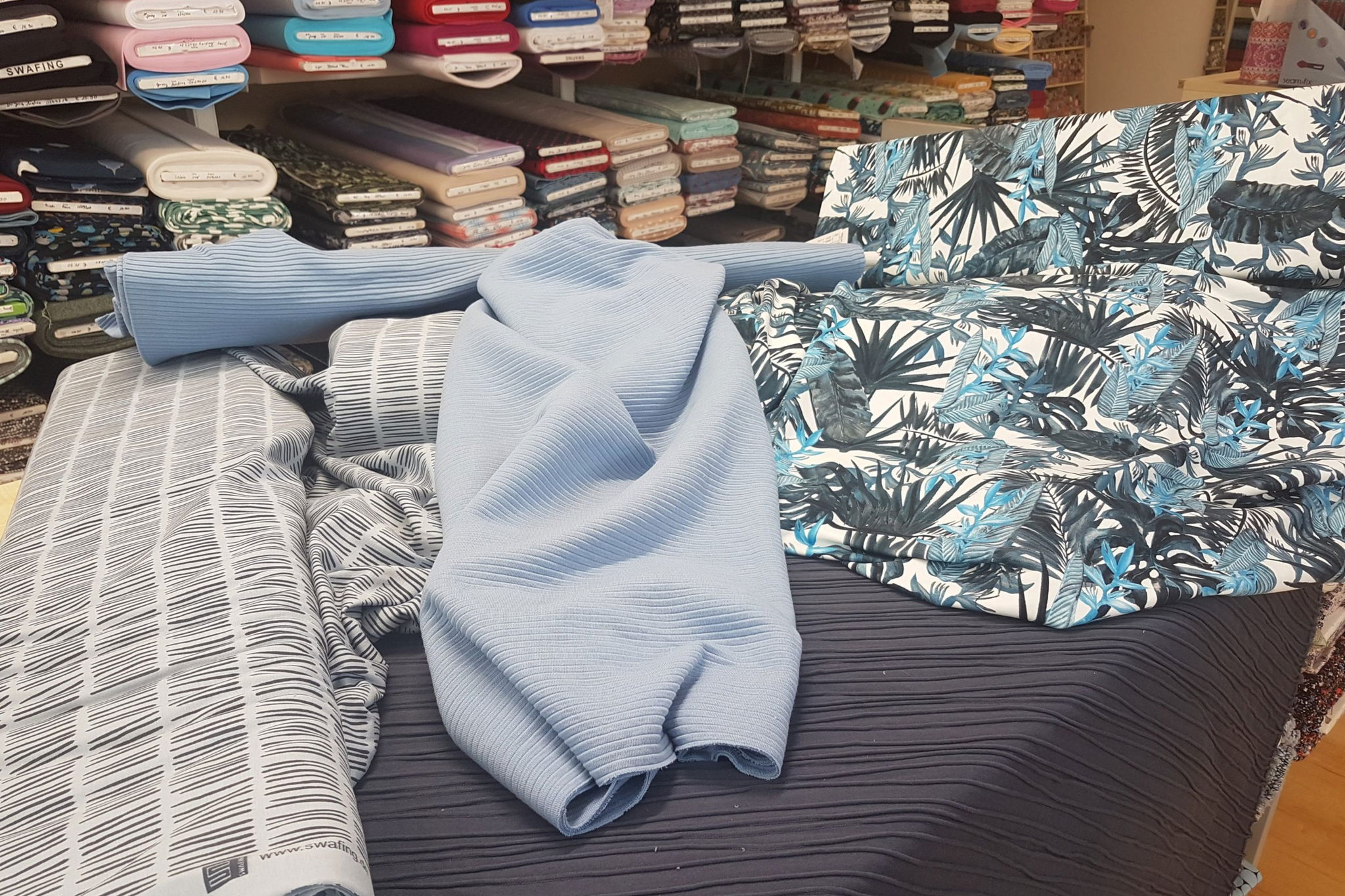 Wir halten für Sie ständig eine großes saisonales Sortiment an unterschiedlichen Stoffballen auf Lager. Dabei führen wir ausschließlich qualitativ hochwertige Markenstoffe von Swafing und S&W-Stoffe.